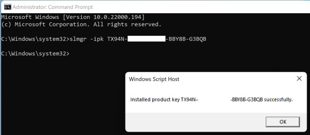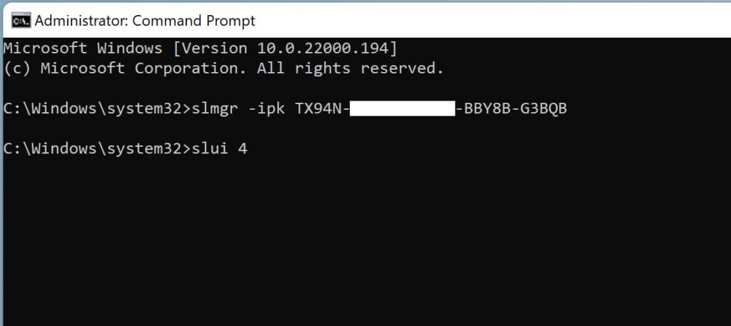 2) In a terminal, type (or better yet, copy and paste) the command: slmgr -ipk XXXXX-XXXXX-XXXXX-XXXXX-XXXXX