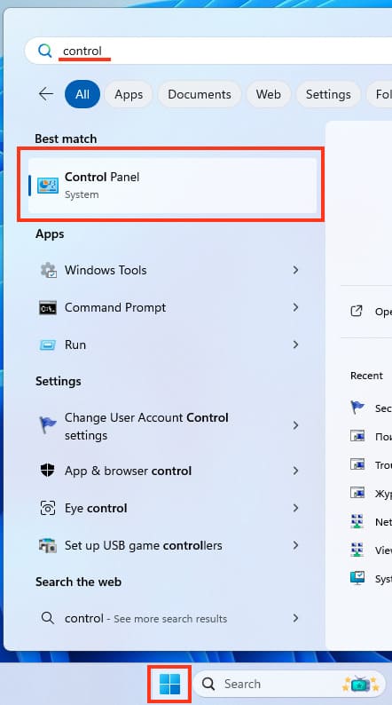 1. Open the search and type «Control Panel».