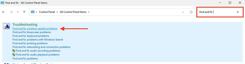 2. In the search at the top left, type «Find and fix» and select «Find and fix windows update problems» from the list.