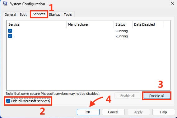 2. Then go to the «Services» section, check «Hide all Microsoft services», click «Disable all», then click «OK» => «Apply».