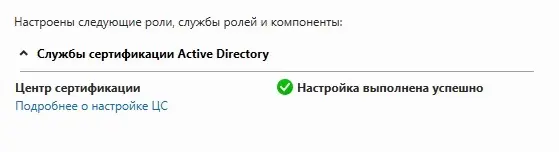 После завершения установки система создаст сертификат CA и запустит службу сертификации.