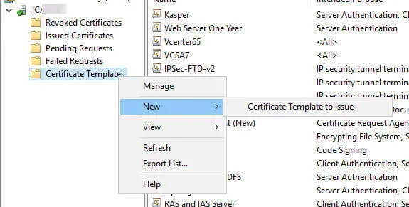 — Опубликуй шаблон через консоль Certification Authority → Certificate Templates → New → Certificate Template to Issue.