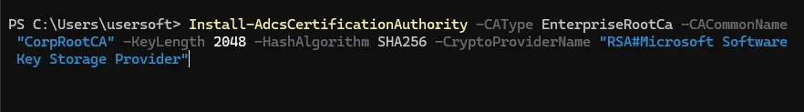 Install-AdcsCertificationAuthority -CAType EnterpriseRootCa -CACommonName "CorpRootCA" -KeyLength 2048 -HashAlgorithm SHA256 -CryptoProviderName "RSA#Microsoft Software Key Storage Provider"