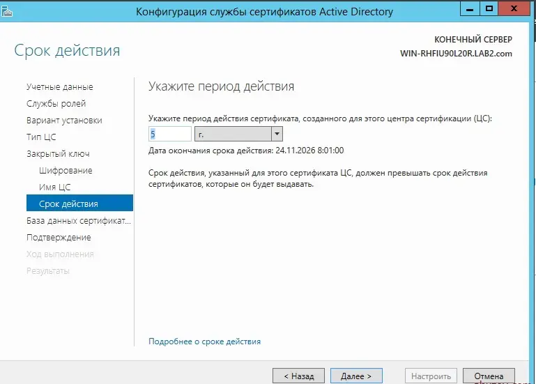 — Установить срок действия корневого сертификата (часто 10–20 лет).