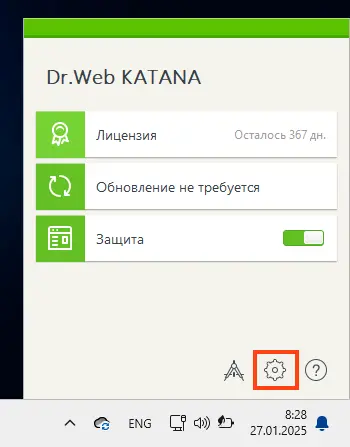 — В открывшемся окне Dr.Web нажмите на иконку шестерёнки (настройки).