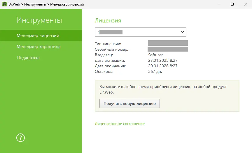 — В главном меню антивируса в разделе «Менеджер лицензий» можно увидеть подробную информацию о вашей лицензии.