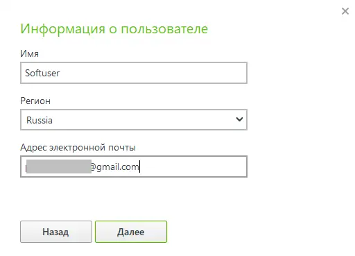 — Введите ваше имя, регион и адрес электронной почты, после чего нажмите «Далее».