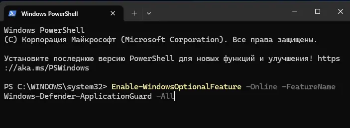 Enable-WindowsOptionalFeature -Online -FeatureName Windows-Defender-ApplicationGuard -All
