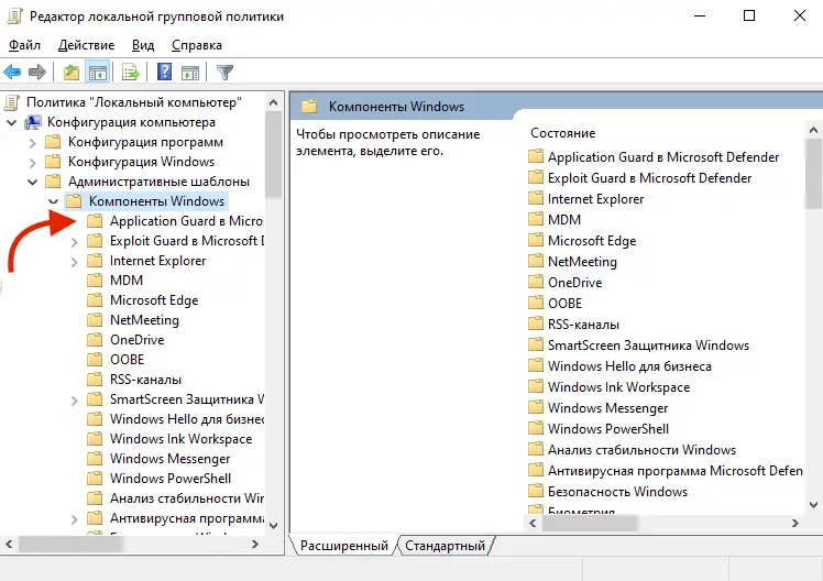 2. Перейдите в раздел Конфигурация компьютера → Административные шаблоны → Компоненты Windows → Microsoft Defender Application Guard.