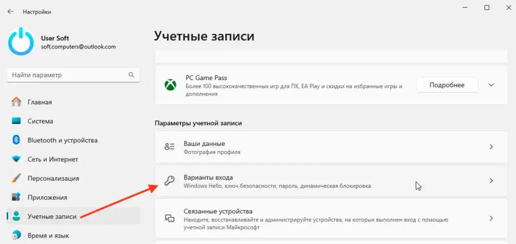 2. Перейдите в Учетные записи → Варианты входа (Accounts → Sign-in options).