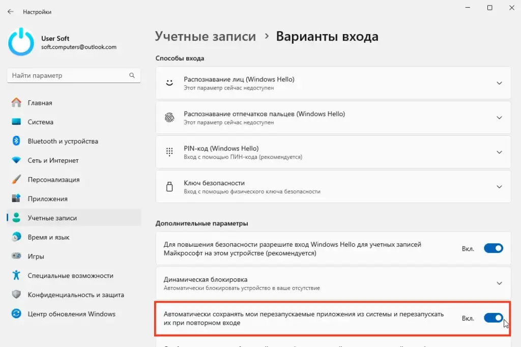 Автоматически сохранять мои перезапускаемые приложения при выходе из системы и перезапускать их после входа (Automatically save my restartable apps when I sign out and restart them after I sign in).