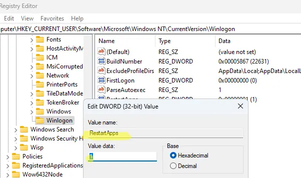 reg add "HKCU\SOFTWARE\Microsoft\Windows NT\CurrentVersion\Winlogon" /v RestartApps /t REG_DWORD /d 1 /f