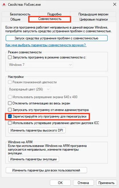 – Не все приложения поддерживают автоматический перезапуск; для них требуется настройка режима совместимости.