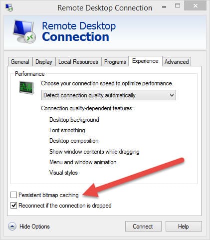 If the above methods did not help, try adjusting the connection settings for the user. In the «Experience» menu, uncheck «Persistent bitmap caching.»