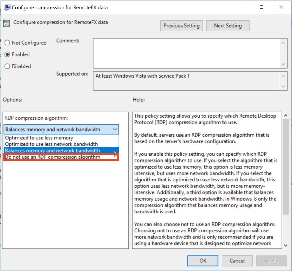 Win + R => gpedit.msc => Computer Configuration => Administrative Templates => Windows Components => Remote Desktop Services => Remote Desktop Session Host => Configure compression algorithm for RDP. Enable the feature and set it to «Do not use an RDP compression algorithm.»