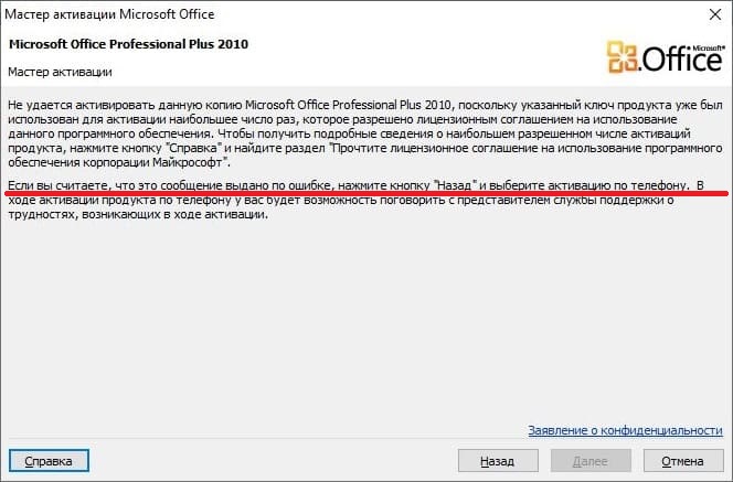 При стандартной активации Microsoft Office 2010 могут выходить следующие ошибки, как к примеру указано на скриншоте ниже. Тогда в этом случае как описано во втором абзаце описания ошибки, нужно активировать Microsoft Office 2010 по телефону.