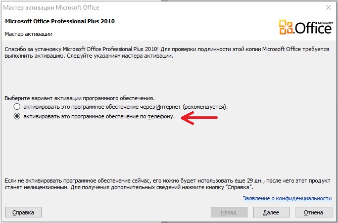 Внимание! На данный момент к сожалению все Российские телефоны Microsoft отключены из-за действующих ограничений. Для телефонной активации Microsoft Office 2010 можете воспользоваться следующими опциями: