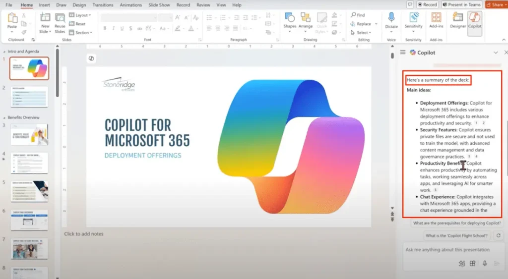 Пример: вы можете загрузить отчёт в Word, а Copilot за несколько секунд превратит его в готовую презентацию с ключевыми пунктами.