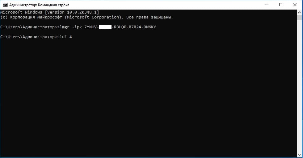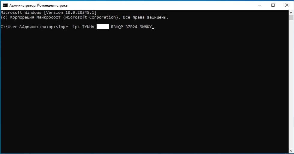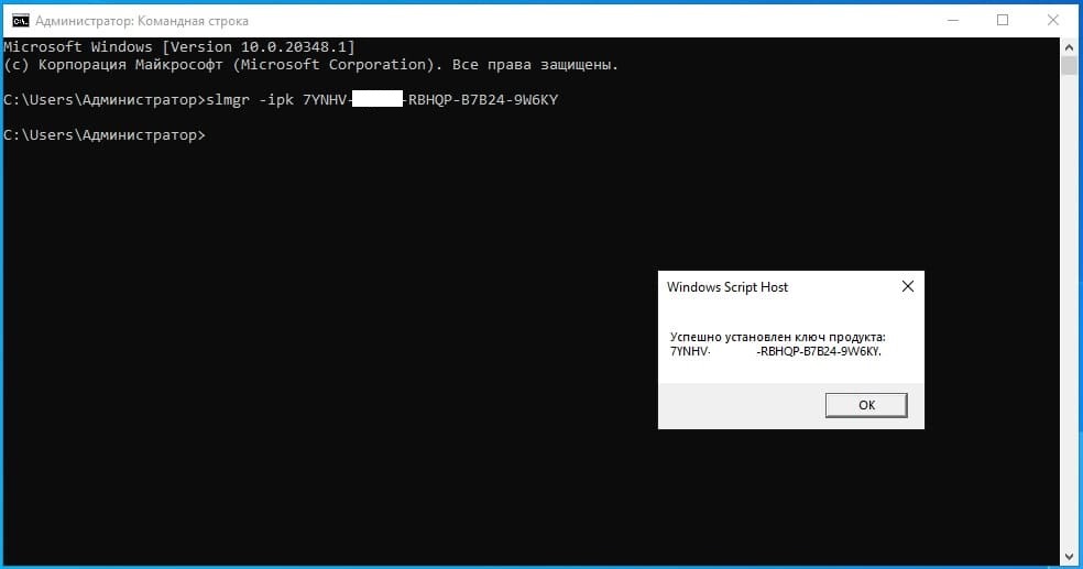2) В терминал вводим (лучше копируем и вставляем) команду: slmgr -ipk XXXXX-XXXXX-XXXXX-XXXXX-XXXXX, где X – это сам ключ.