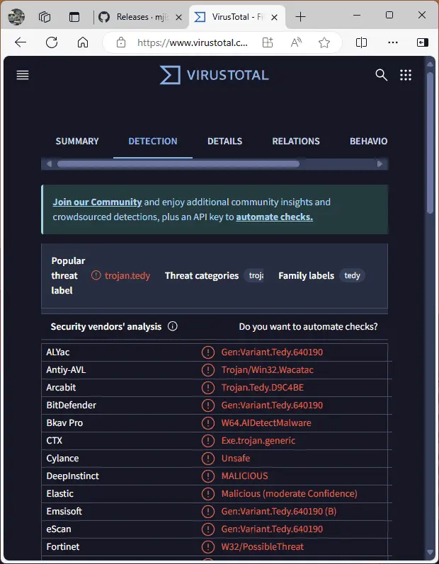 Антивирусы, включая Windows Defender, и сервисы вроде VirusTotal могут помечать Alt App Installer как подозрительный файл. Это связано с тем, что программа написана на Python и скомпилирована в .exe с помощью PyInstaller, что часто вызывает ложные срабатывания. Разработчик (mjishnu) на GitHub работает над версией на C#, чтобы устранить эту проблему.