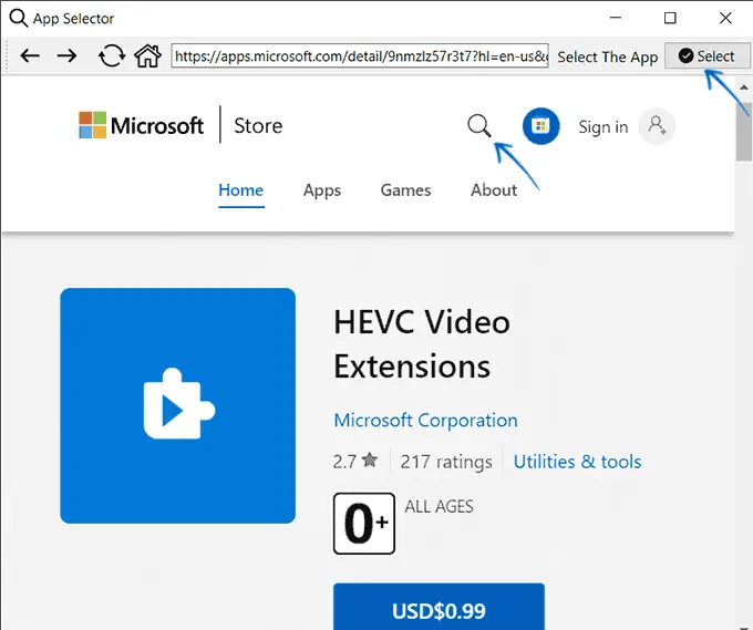 – После нахождения приложения нажмите «Select» в правом верхнем углу окна браузера.