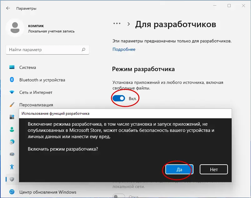 – Проверьте, что у вас включён режим разработчика: Параметры → Конфиденциальность и безопасность → Для разработчиков → Режим разработчика.