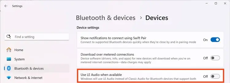 3. – В «Параметры → Bluetooth & устройства → Устройства» пролистайте до раздела настроек устройства — если поддержка есть, должна отображаться опция «Use LE Audio when available» (или «Использовать Bluetooth LE Audio, если доступно»). Если её нет — скорее всего, что-то из железа или драйверов не поддерживает.