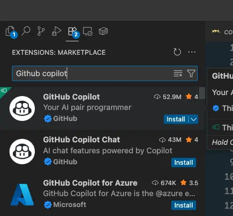 3. Найдите и установите расширение GitHub Copilot.