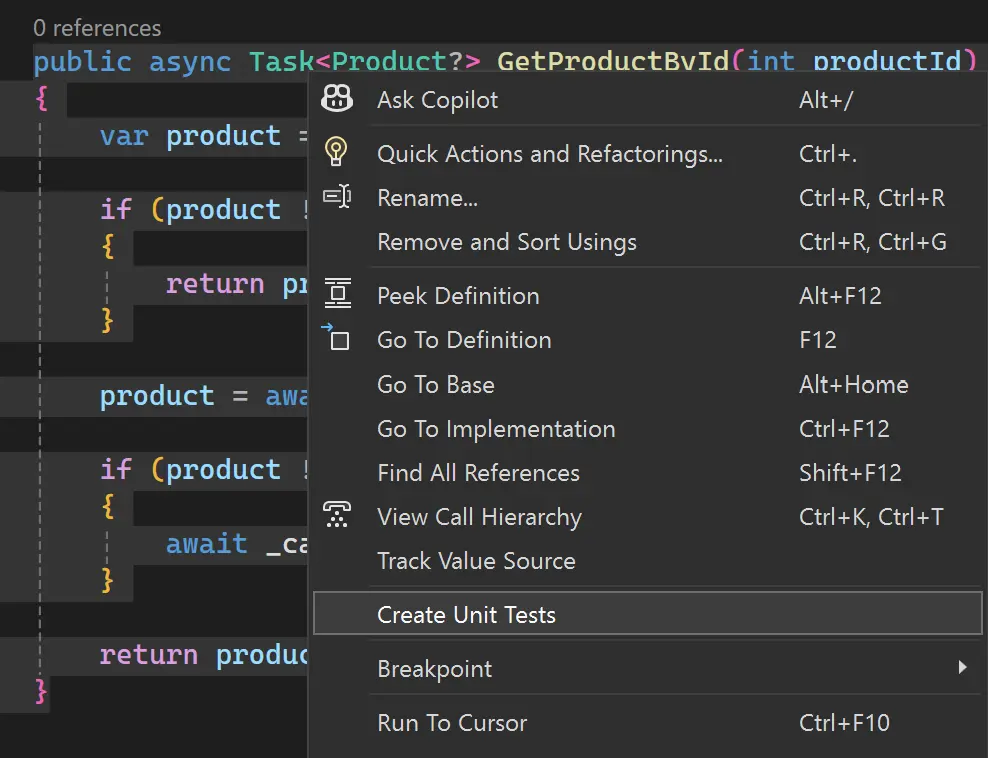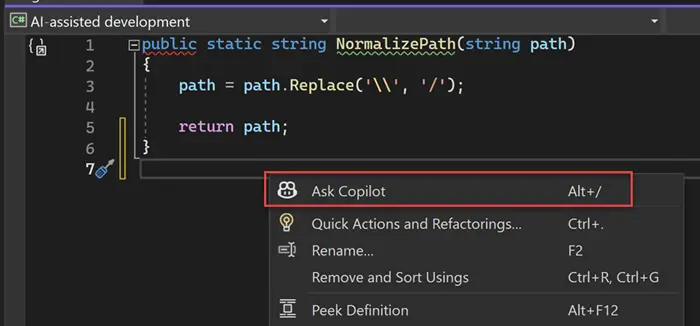 Copilot автоматически сгенерирует готовую функцию на выбранном языке (например, C#).