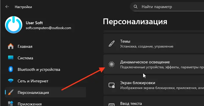 2. Перейдите в раздел Персонализация → Динамическое освещение (Dynamic Lighting).