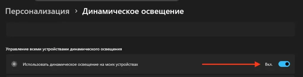 3. Найдите переключатель Использовать динамическое освещение на моих устройствах (Use Dynamic Lighting on my devices) и включите его.