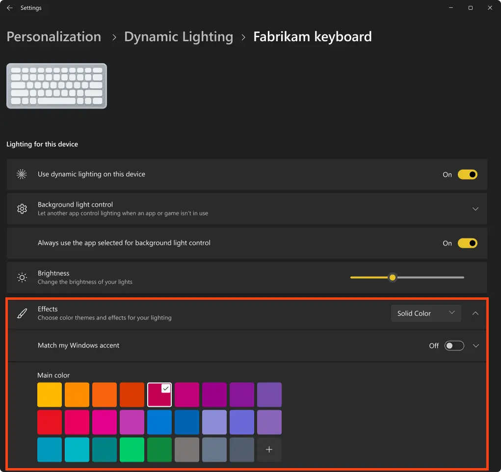 – Windows Dynamic Lighting предлагает базовые эффекты, такие как Solid Color, Breathing, Wave, Gradien, Rainbow и др.
