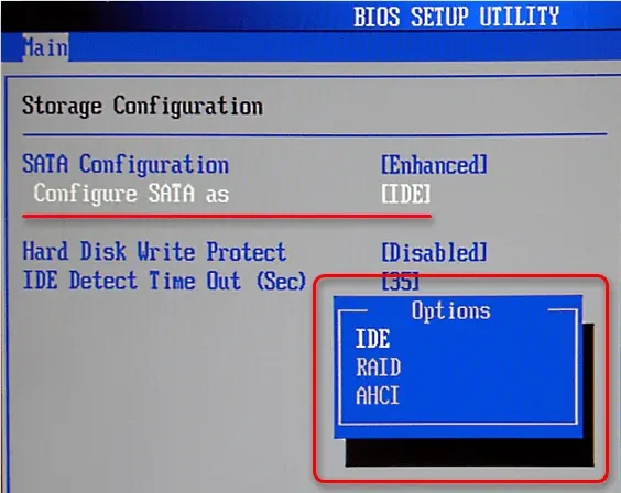 – Изменение режима SATA/контроллера в BIOS/UEFI (AHCI ↔ IDE/RAID).