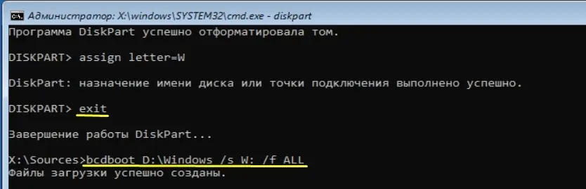 Если команда /fixboot возвращает ошибку доступа, попробуйте дополнительно выполнить команды для определения и назначения EFI-раздела, а затем восстановить BCD:
