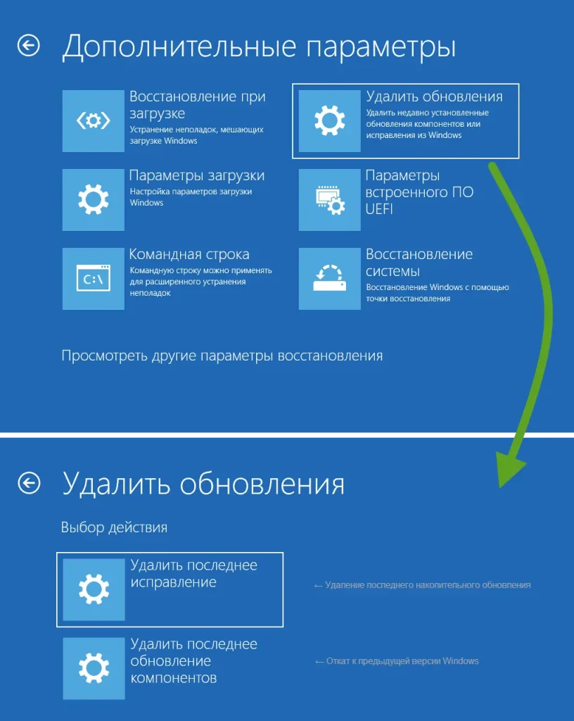 – В WinRE выберите «Удалить последние обновления» → сначала пробуйте удалить качественные (quality) обновления, затем функциональные (feature) при необходимости.