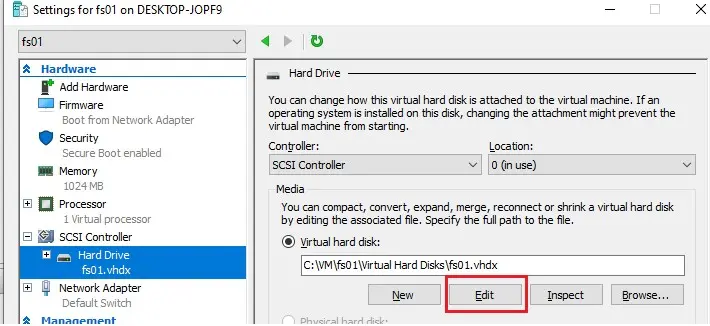 Увеличение размера VHDX-диска в Hyper-V Manager