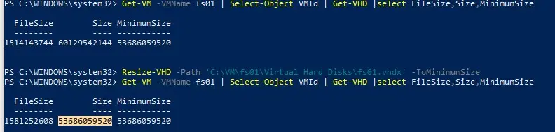 Resize-VHD -Path 'C:\VM\fs01\Virtual Hard Disks\fs01.vhdx' -ToMinimumSize