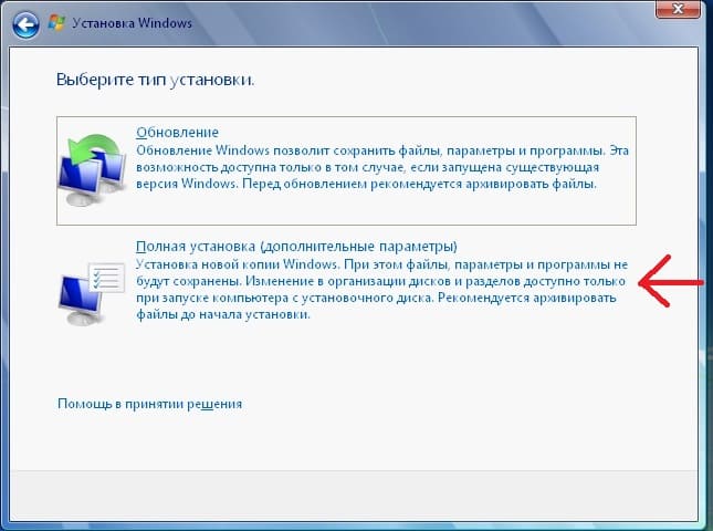 Непосредственное “Обновление” из установщика так же не будет работать, поэтому выбираем “Полную установку” в ней мы не будем производить форматирование раздела (жесткого диска), после установки Windows 7 у Вас в корне диска “C” будет папка “Windows.old”, там будут все системные файлы и Ваши личные файлы, которые находились в системных папках.