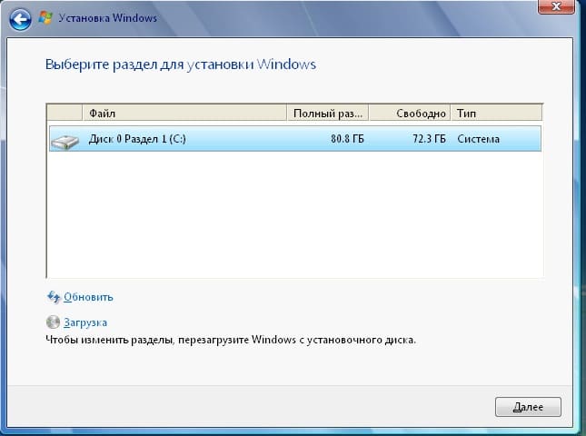 Здесь просто жмем далее в нашем случае, в Вашем может быть вариант выбора раздела, выберите нужный для установки.