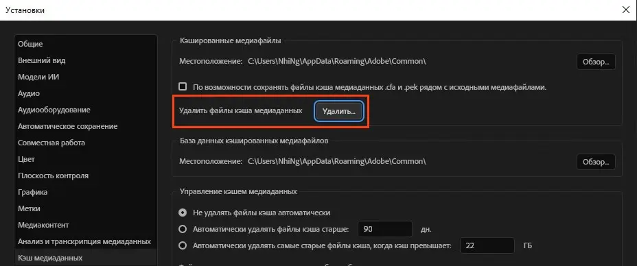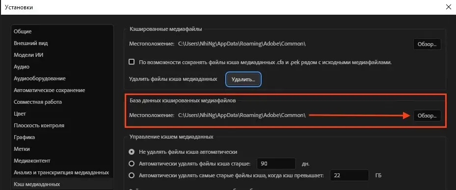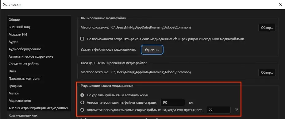 Вернитесь в настройки Premiere Pro (Preferences -> Media Cache). Внизу окна есть блок «Управление кэшем медиаданных» (Media Cache Management).