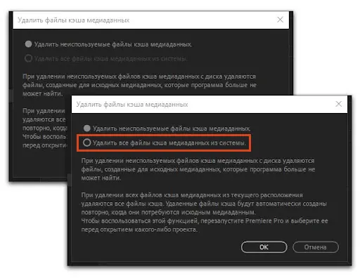 — «Удалить все файлы кэша из системы» (Delete all media cache files from the system).