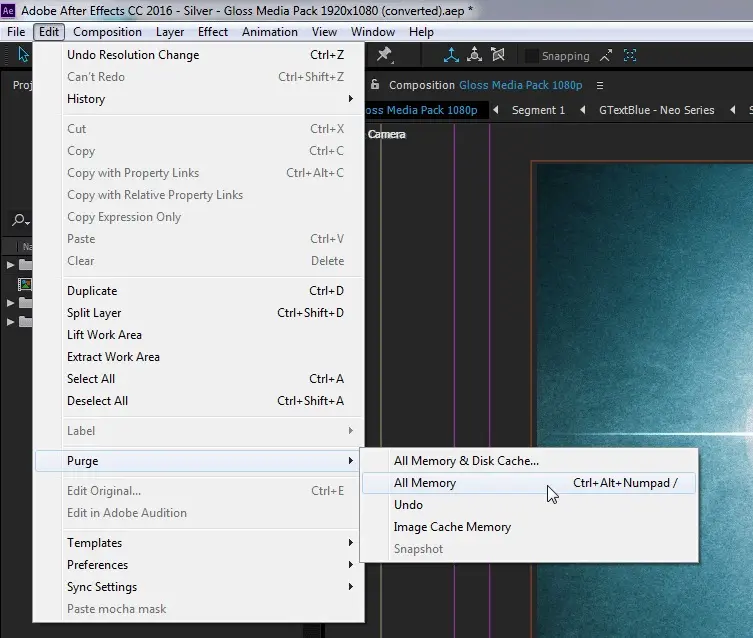 2. Перейдите в меню Правка (Edit) -> Очистить (Purge) -> Вся память и кэш диска (All Memory & Disk Cache).