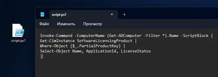 Этот код покажет статус активации и редакцию продуктов на всех компьютерах в домене.