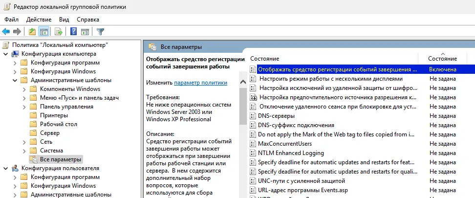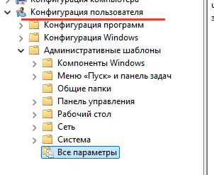 2. Перейдите в раздел Политика «Локальный компьютер» -> Конфигурация компьютера -> Административные шаблоны -> Все параметры.