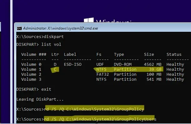 Если из-за некорректных GPO вход в систему невозможен или заблокированы инструменты (например, Командная строка через AppLocker), выполните сброс с загрузочного носителя: