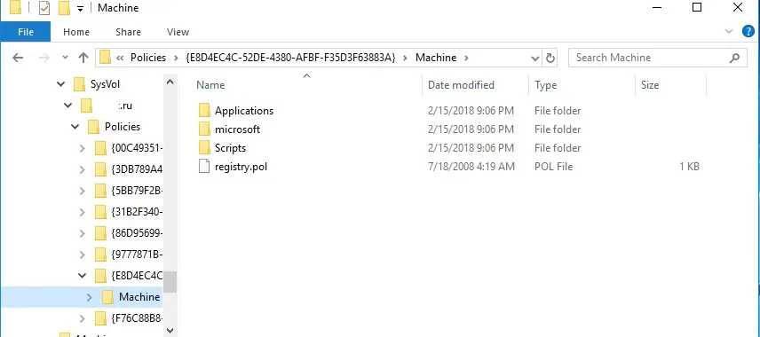 Каждая политика хранится в папке с уникальным GUID. При выходе компьютера из домена кеш обычно очищается, но иногда доменные политики продолжают действовать.