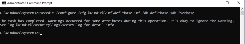 secedit /configure /cfg %windir%\inf\defltbase.inf /db defltbase.sdb /verbose