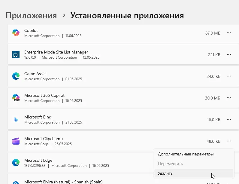2. Найдите приложение (например, Microsoft.Clipchamp) и нажмите Удалить.