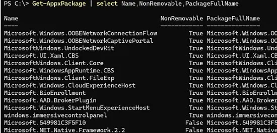 Get-AppxPackage | Select-Object Name, NonRemovable, PackageUserInformation, PackageFullName