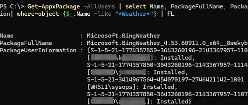 Get-AppxPackage -AllUsers | Where-Object {$_.Name -like "*Weather*"} | Select-Object Name, PackageFullName, PackageUserInformation | Format-List